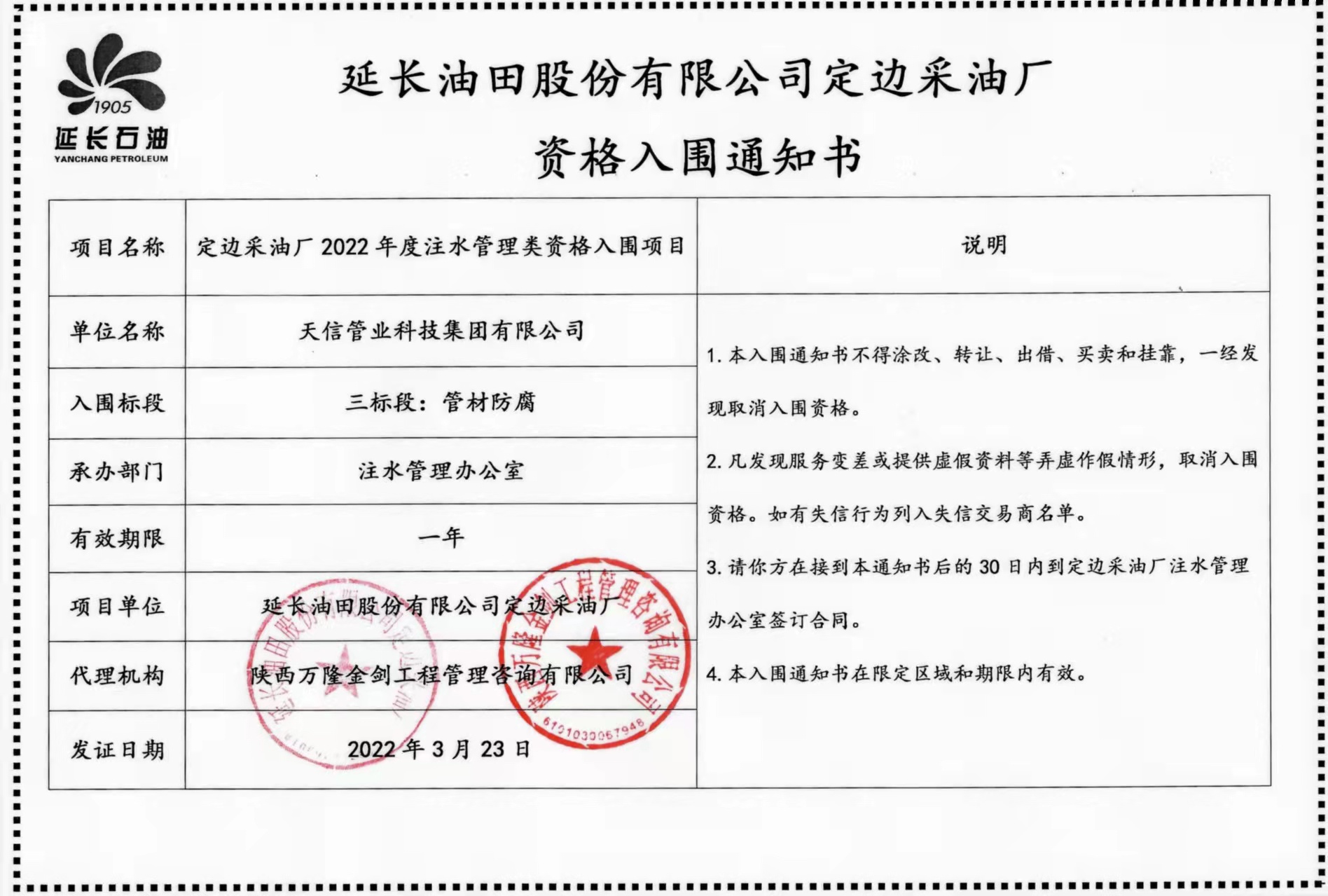 2022年3月10日,我公司投標(biāo)的定邊采油廠2022年度注水管理類資格入圍“第三標(biāo)段管材防腐”項(xiàng)目(項(xiàng)目編號(hào)YCDCZB2021-ZR-17),在11家公司參與的激烈競(jìng)爭(zhēng)中以第一名的好成績(jī)成功入圍,這是公司實(shí)力的再次體現(xiàn),意味著我公司今后可以參與定邊采油廠注水管理類管材防腐項(xiàng)目的招標(biāo)、建設(shè),公司全體員工表示熱烈的祝賀,祝愿銷售部門再接再厲,為公司的發(fā)展再創(chuàng)佳績(jī)。也希望公司各部門振奮精神,團(tuán)結(jié)協(xié)作,推進(jìn)各項(xiàng)工作再上新的臺(tái)階。